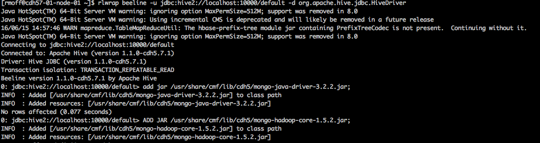 Here’s all the various errors that I got in the hive-server2.log during my attempts to get a CREATE EXTERNABLE TABLE to work against a MongoDB table in Hive: