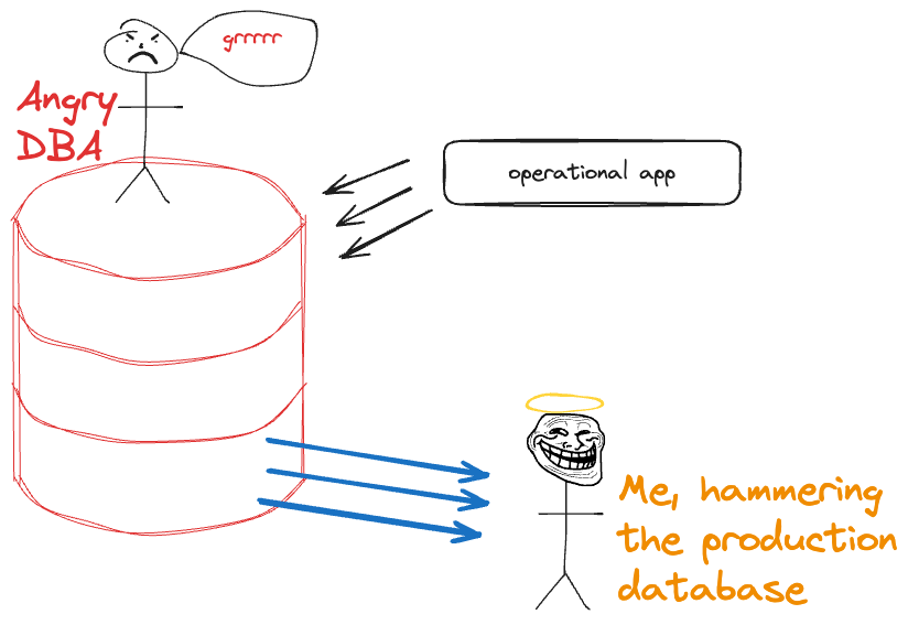 Or do you? Perhaps you could just use the data in place. After all, who doesn’t enjoy baiting the friendly neighborhood DBA? What could possibly go wrong with running unbounded queries on a production database that’s backing an operational system? 🤡