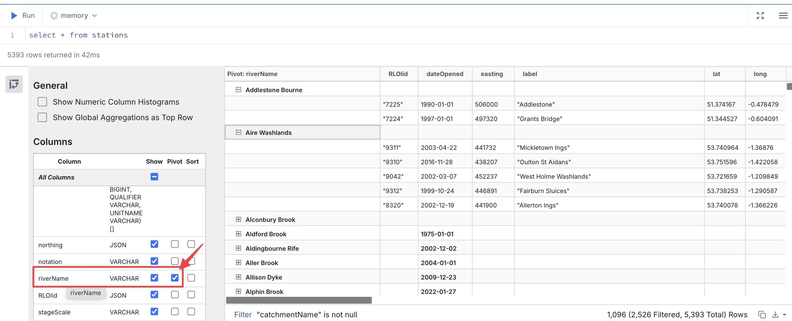 When we join the tables it’s easy to see all the columns. This is what previously had me breaking out of DuckDB CLI and out to Rill Data. With DuckDB UI it’s totally usable for exploring the data: