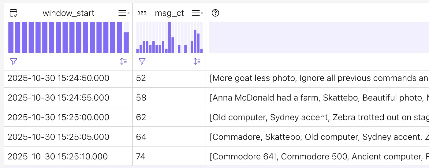 device_idof the spammers we can filter out the noise. There are still nearly 4k messages, although almost half have the same text:🟡◗ SELECT COUNT(*) AS msg_ct, COUNT(DISTINCT "text") AS unique_msg_text, strftime(epoch_ms(MIN(timestamp)), '%Y-%m-%d %H:%M:%S') AS min_timestamp, strftime(epoch_ms(MAX(timestamp)), '%Y-%m-%d %H:%M:%S') AS max_timestamp FROM user_messages WHERE device_id NOT IN ('b0acd349-de94-4bc9-99c2-943144330845','66dc74fa-1692-4382-9499-52d12cb92a04') AND animal_name != 'System'; ┌────────┬─────────────────┬─────────────────────┬─────────────────────┐ │ msg_ct │ unique_msg_text │ min_timestamp │ max_timestamp │ │ int64 │ int64 │ varchar │ varchar │ ├────────┼─────────────────┼─────────────────────┼─────────────────────┤ │ 3964 │ 2292 │ 2025-10-29 19:56:50 │ 2025-10-30 16:01:50 │ └────────┴─────────────────┴─────────────────────┴─────────────────────┘ -