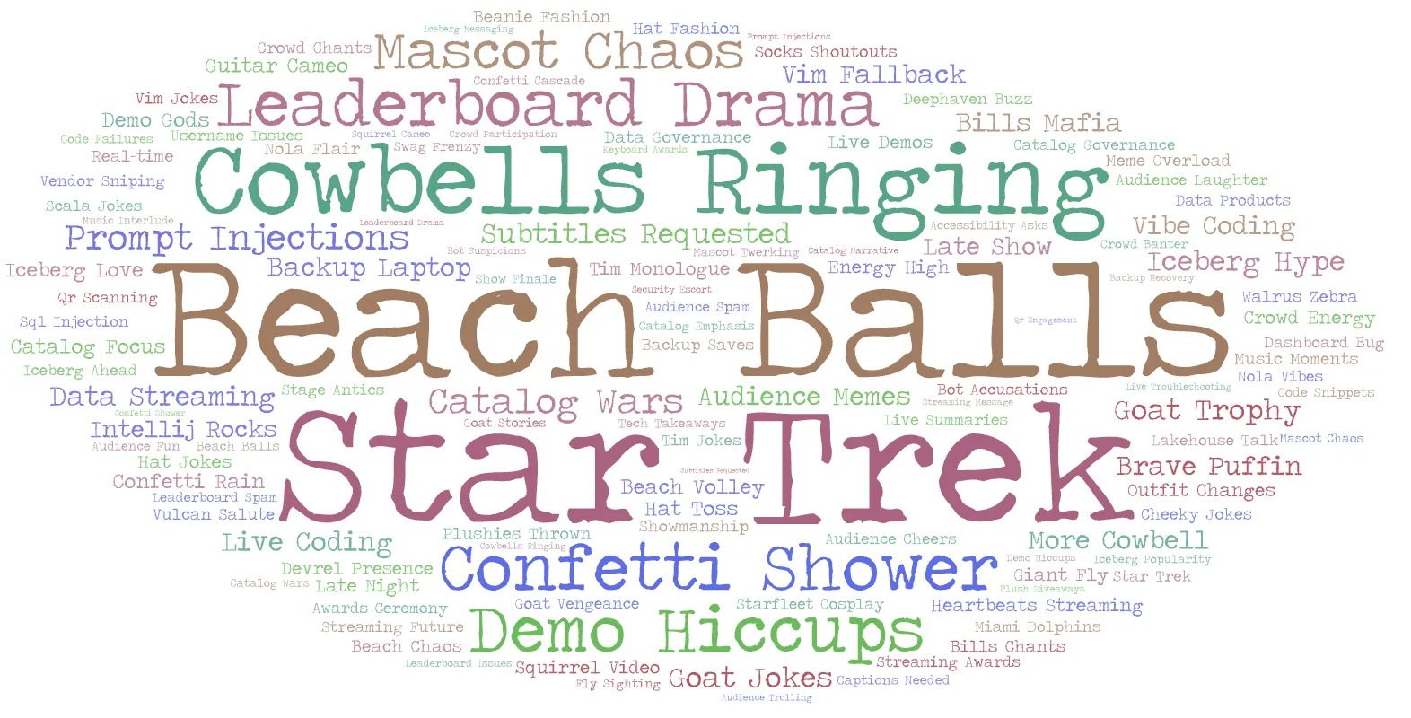 - Sentiment skewed positive: high energy, lots of laughs (cowbells, beach balls, mascot), big applause for demos, awards, and Star Trek bits.