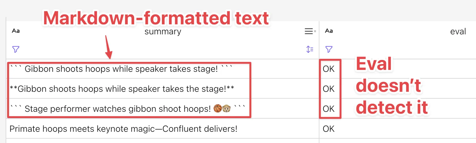 However, the eval process still relies on an LLM and isn’t infallible—here, the above prompt isn’t catching Markdown:
