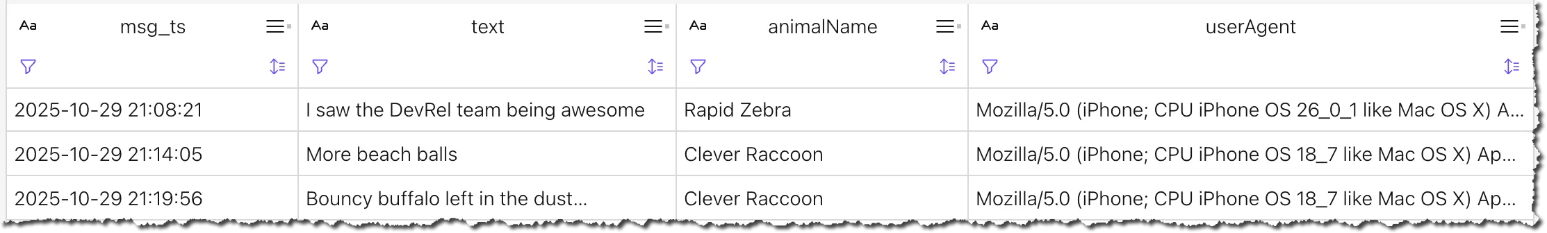 So we’ve got collections of user messages that represent the observations in a room at a point in time for the last 90 seconds. Here’s a (real) example: